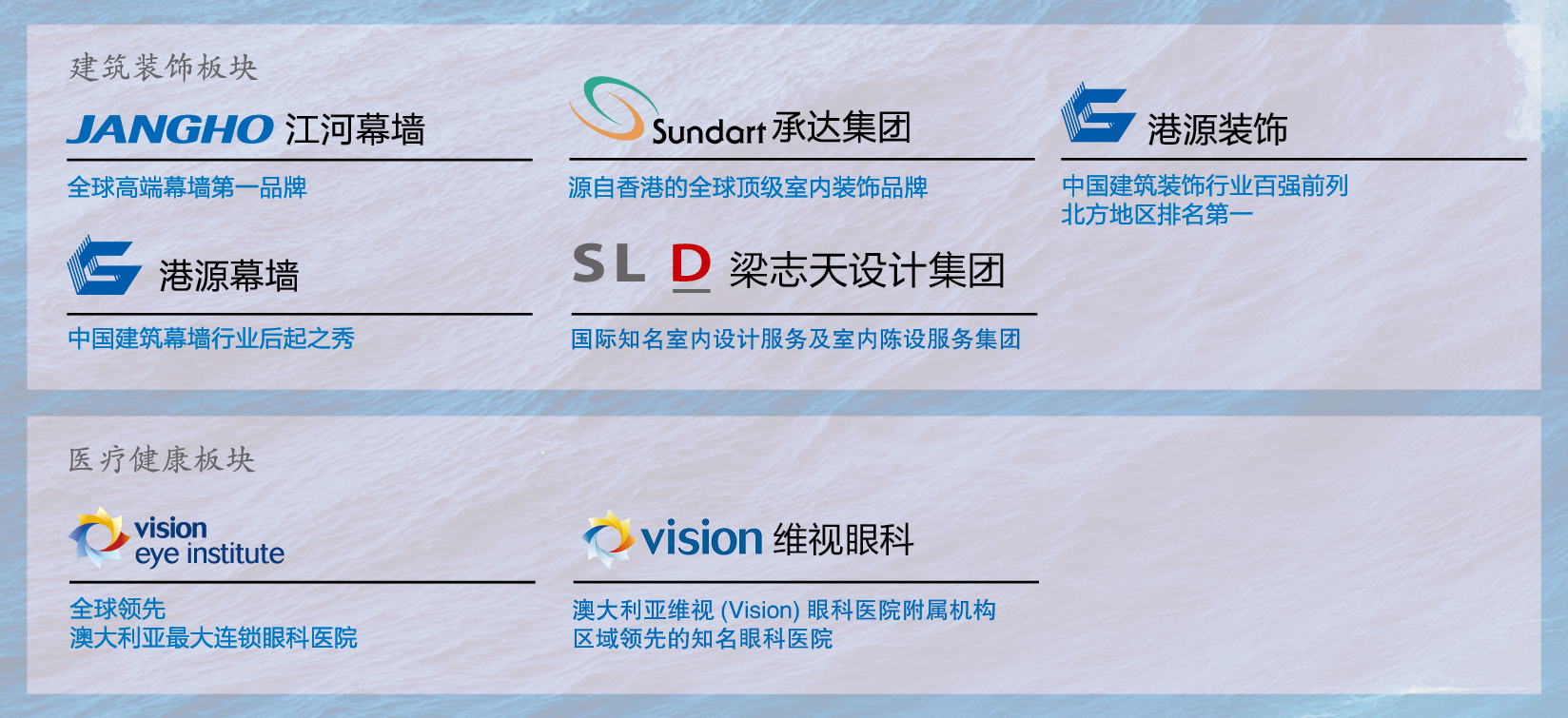 江河集团以“为了人类的生存环境和健康福祉”为企业使命,致力于提供绿色建筑系统和高品质医疗健康服务,坚持“双主业,多元化”发展战略,旗下拥有arcadespeed江河幕墙、Sundart承达集团(HK.1568)、港源装饰、港源幕墙、SLD梁志天设计集团(HK.2262)、Vision、江河泽明、江河华晟等行业知名品牌,业务遍布全球二十多个国家和地区,在建筑幕墙、室内装饰与设计、眼科医疗等专业领域居世界领先水平。江河集团是国家高新技术企业、国家技术创新示范企业、首批国家级知识产权优势企业,国家认定企业技术中心、博士后科研工作站,位居中国上市公司500强、中国民营企业500强。